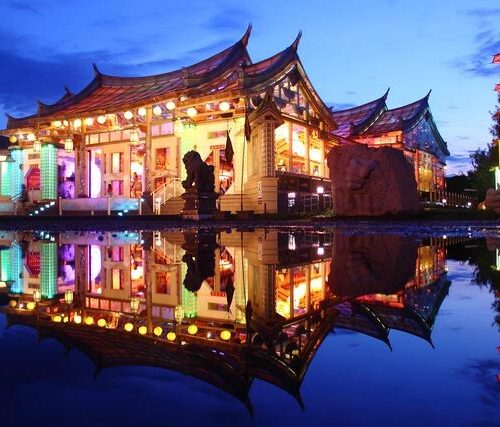 ✨🛕 當信仰遇見光,夜晚開始發亮 Where Faith Glows at Night 那天傍晚,我來到一座會發光的廟。 天還沒全黑,玻璃開始反射光線,到了夜晚…